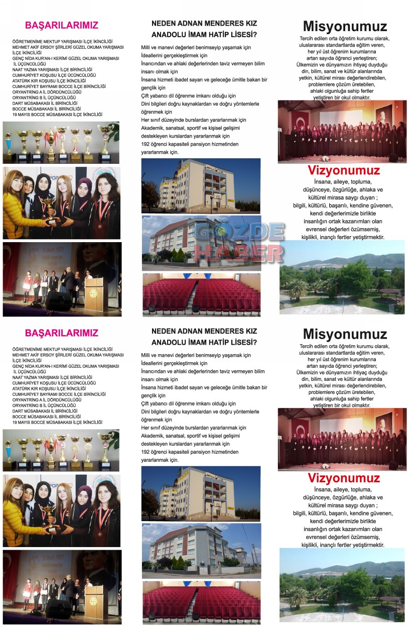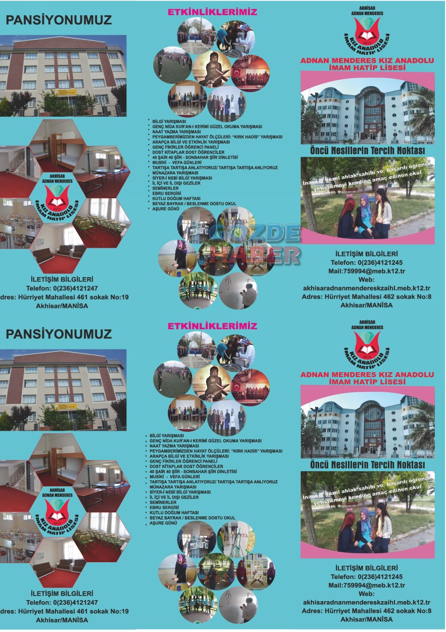 İnançlı, güzel ahlak sahibi ve başarılı öğrenci yetiştirmeyi kendine amaç edinen Adnan Menderes Kız Anadolu İmam Hatip Lisesi; pansiyonu, etkinlikleri, başarıları, misyonu, vizyonu, Fen Bilimleri ve Sosyal Bilimler ağırlıklı sınıfları ve başarılı öğrencilere burs imkanları ile gelecek sene de hizmetinizde.