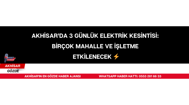 Akhisar’da planlanan şebeke yenileme ve yapım çalışmaları kapsamında bazı mahalle ve kırsal bölgelerde elektrik kesintisi uygulanacak. Yetkililerden yapılan açıklamaya göre, çalışmalar üç gün boyunca belirlenen saatlerde gerçekleştirilecek.