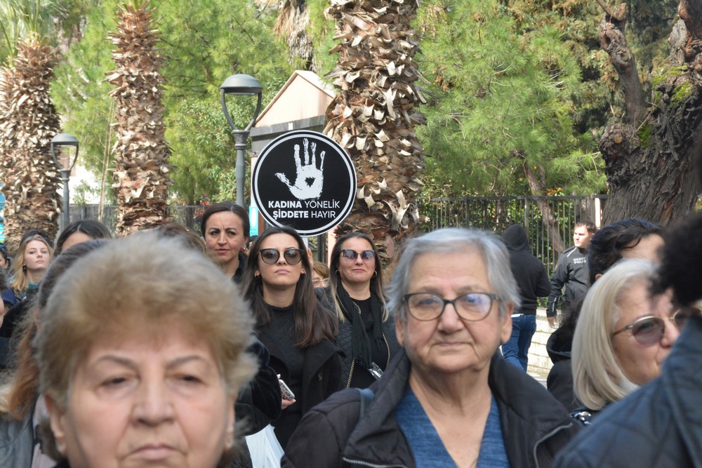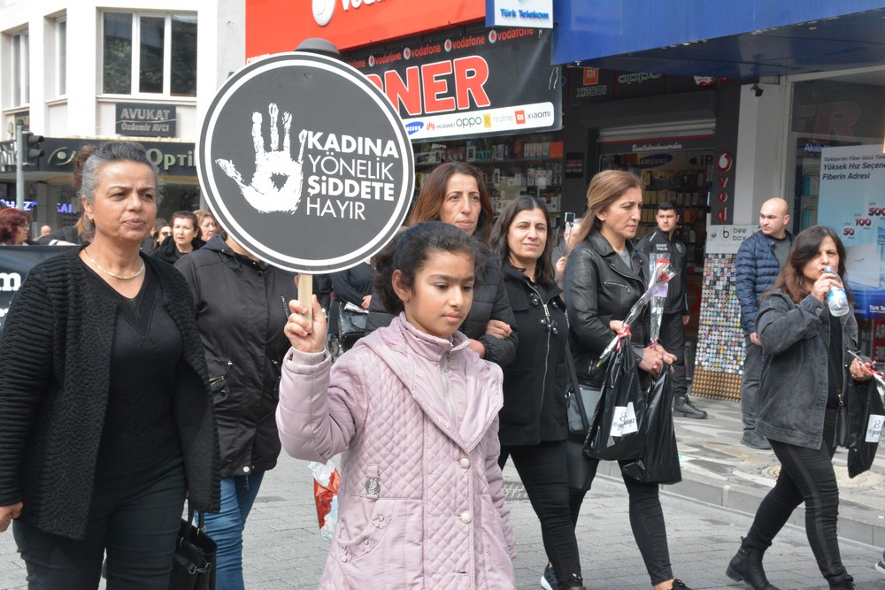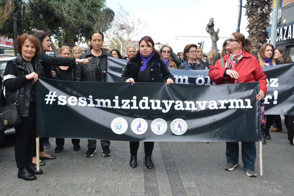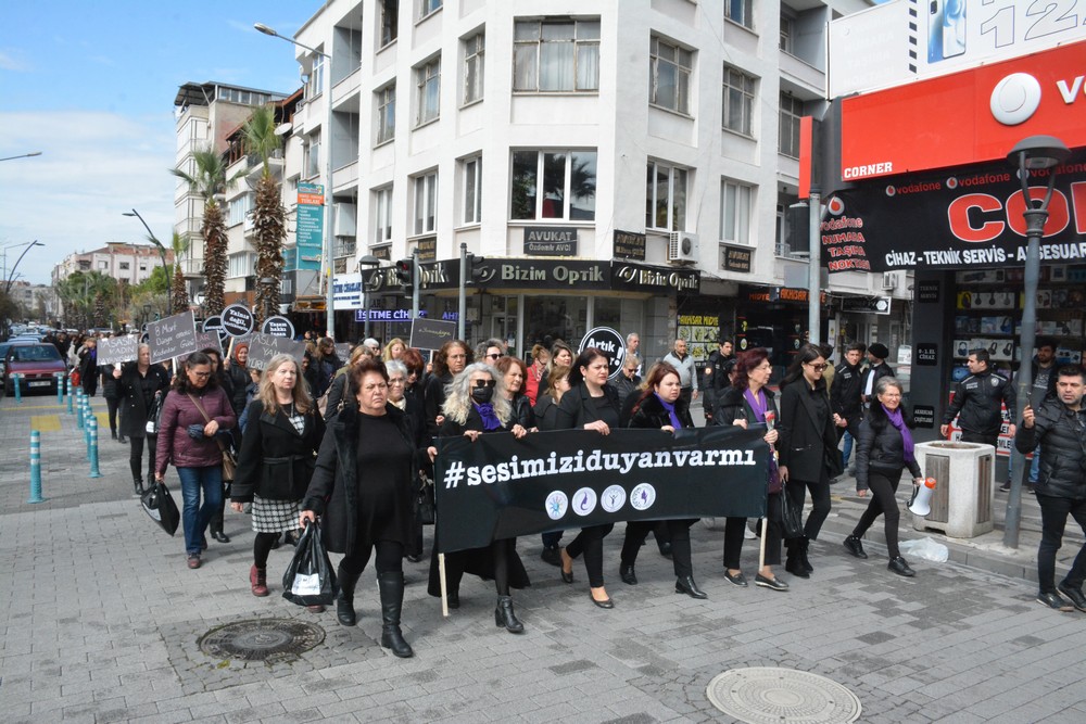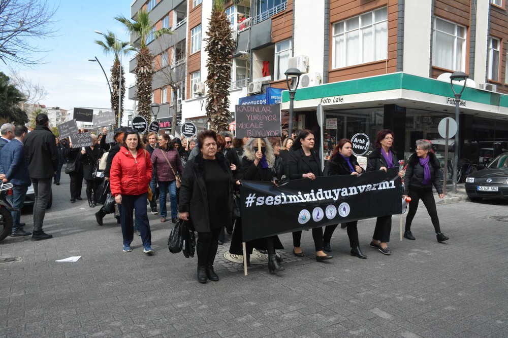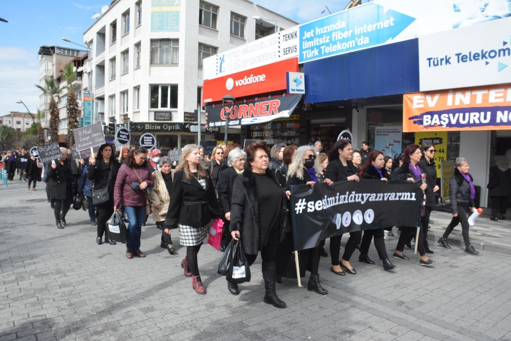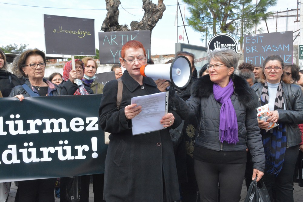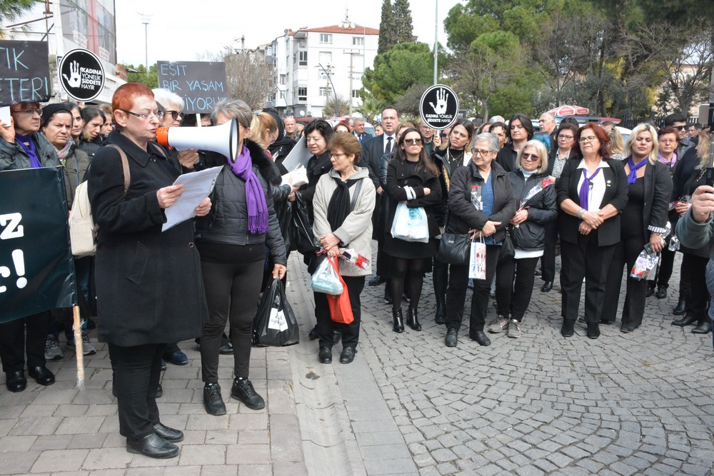 Polis ekipleri kontrolünde yoğun katılım ile gerçekleşen yürüyüş sonrası Akhisar Kadın Derneği Yönetim Kurulu Üyesi Cevriye Emre basın açıklamasını okudu.
