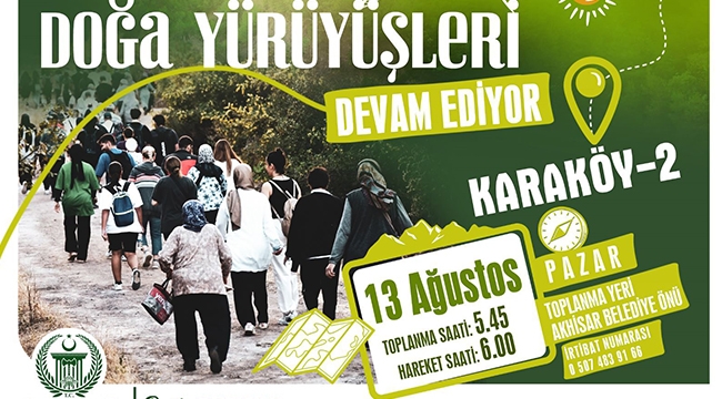 Karaköy Doğa Yürüyüşüne katılmak isteyenlerin 06 Ağutsos Pazar günü saat 06.00'da Akhisar Belediyesi önünde toplanmaları gerekiyor.