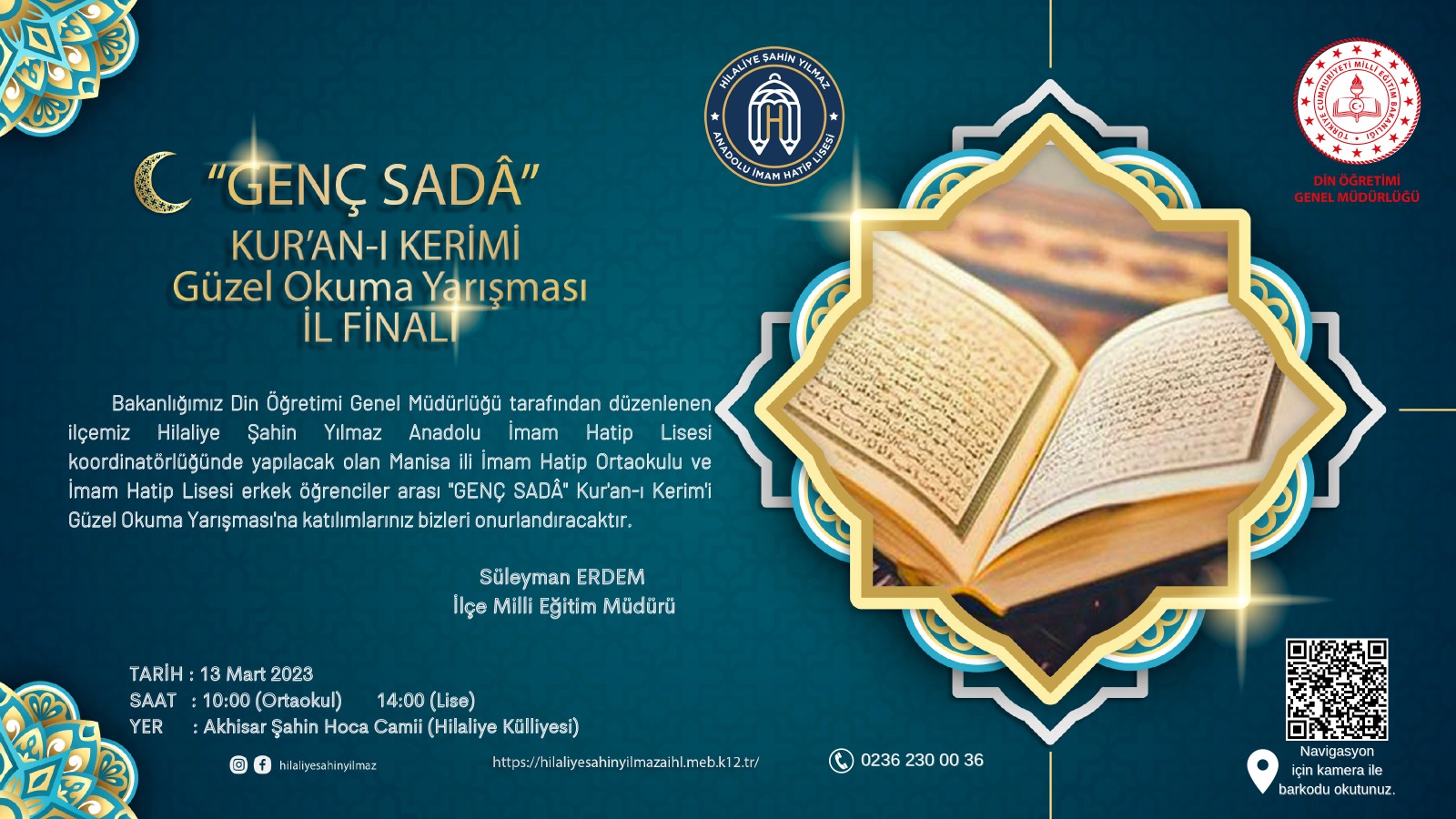 Milli Eğitim Bakanlığı Din Öğretimi Genel Müdürlüğü tarafından her yıl düzenlenen İmam Hatip Ortaokulları ve İmam Hatip Liseleri arası Mesleki yarışmalardan "GENÇ SADÂ" Kur'an-ı Kerim'i Güzel Okuma Yarışması Manisa il finali ilçemizde yapılacak. Bu yıl "GENÇ SADÂ" Kur'an-ı Kerim'i Güzel Okuma Yarışması'na ilçemiz Hilaliye Şahin Yılmaz Anadolu İmam Hatip Lisesi ev sahipliğinde, Akhisar Şahin Hoca Camii’nde yapılacak. Manisa geneli İmam Hatip Ortaokulları arası "GENÇ SADÂ" Kur'an-ı Kerim'i Güzel Okuma Yarışması 13 Mart Pazartesi günü saat 10:00’da, aynı gün öğleden sonra saat 14:00’te ise Anadolu İmam Hatip Liseleri arası "GENÇ SADÂ" Kur'an-ı Kerim'i Güzel Okuma Yarışması yapılacak. Yarışmanın birincisi bölge finallerinde Manisa ilimizi temsil edecek. İlçemizin ev sahipliğinde yapılacak olan yarışmaya tüm halkımız davetli olup katılımlarınız bizleri onurlandıracaktır.