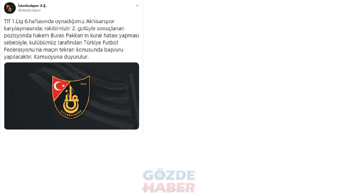 Akhisarspor’un geçtiğimiz gün deplasmanda berabere kaldığı İstanbulspor maçı iptal edilecek mi? Maçın tamamına yakınında üstün oynamasına rağmen 90 ve 90+6. Dakikalarda kalesinde gördüğü gollerle yıkılan Akhisarspor’a kural hatası şoku. 1 saat önce İstanbulspor’un sosyal medya hesabı üzerinden yapılan resmi açıklamaya göre maç için TFF’ye başvurulacak. İşte o açıklama: “Tff 1.Lig 6.haftasında oynadığımız Akhisarspor karşılaşmasında; rakibimizin 2. golüyle sonuçlanan pozisyonda hakem Burak Pakkan’ın kural hatası yapması sebebiyle, kulübümüz tarafından Türkiye Futbol Federasyonu’na maçın tekrarı konusunda başvuru yapılacaktır. Kamuoyuna duyurulur.”