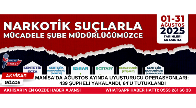 Manisa İl Emniyet Müdürlüğü Narkotik Suçlarla Mücadele Şube Müdürlüğümüzce (Akhisar, Alaşehir, Salihli, Soma ve Turgutlu NSM Büro Amirlikleri ile birlikte) ilimiz genelinde uyuşturucu madde ticareti yapan, aracılık eden, nakleden ve kullanan/bulunduran şahısların deşifresine yönelik