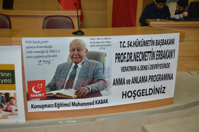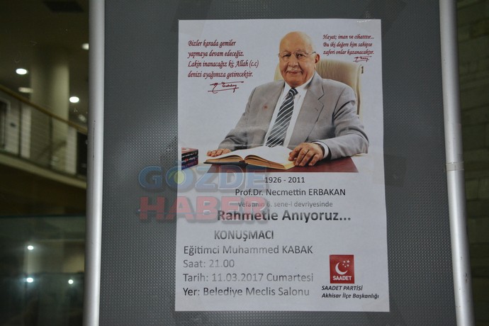 Akhisar Saadet Partisi ilçe teşkilatı Merhum Necmeddin Erbakanın ölümünün 6. Yılında anma proğramı düzenledi. Akhisar Saadet Partisi ilçe teşkilatı Merhum Necmeddin Erbakanın ölümünün 6. Yılında Akhisar Belediye meclis salonun da anma proğrama konuk konuşmacı olarak Eğitimci Muhammed Kabak konuk oldu. Saadet Partisi Kırkağaç İlçe Başkanı Abdullah Yılmaz sunuculuğunu yaptığı Prf. Dr. Merhum Necmeddin Erban´ı anma proğramı Avrupa Milli Görüş Teşkilatı İmam Hatiplerinden Metin Meral´in okuduğu Kuran Tilaveti ile başladı. Okuran Kuran Tilavetine müteakip Akhisar Bayburtlular dernek Başkanı Aydan Akkuş´un kızı Şahi Nur Akkuş´un okuduğu şiir ile devam etti.Açılış konuşmasını yapan Saadet Partisi Akhisar İlçe Başkanı Fikret Aysu “Teşkilatım ve şahsım hadına hepize hoş geldiniz diyor. Sözlerime Rahmetli Erbakan Hocamızın bir hitabı ile başlamak istiyorum.Her hangi bir kimse Malazgirtte inancını yaşamadım, Kosovada Güneydoğuda bir kılınç olup parlamadan, Ulubatlı Hasan olup İstanbul´u fethi etmeden sultan Fatihi olup atını denize sürmeden Kanuni olup şanlı ordularıyla Avrupanın içine gitmeden Seyyit çavuş olup 250 kiloluk mermiyi ya Allah deyip namluya sürmeden, Bir insan Sakarya´nın Perileri´ne girmeden ve Kıbrıs´tan düşman tahribatın içinden geçmeden milli görüşün ne olduğunu anlayamaz. Evet Muhterem hazirun rahmetli hocamız geçmişteki ataları, dedeleri gibi besmele çekerek Bu davaya başladı. Bismillah dedi bu ülkede toplu iğne yapılmazken bu ülkede çiftçi insanına motorunu hediye etti yüzde yüz yerli yapım arabayı hediye etti, yılmadı 1969 yılında meclise girdi tüm aydınların uçuştuğu bir zamanda Esselamün Aleyküm ve rahmetullahi ve berekatühü diyerek meclisteki konuşmasına başladı. Yine bir besmele çekti Kıbrıs´ta elhamdülillah yıllardır zulme uğrayan kardeşlerimizin kurtuluşuna vesile oldu, yine bir besmele çekti Anadolumuzu baştan başa fabrikalarla donattı 400 kusur fabrikan´ın 80 tanesini bitirerek bu vatan evlatlarına hediye etti, eğer 400 tanesi Bitmiş olsaydı Japonya´nın Almanya´nın Kore´nin 14 yılda tamamladı ağır sanayi beş yılda tamamlayıp bu milletin hizmetine alacaktı. Ama her zaman olduğu gibi yine önünde bir sürü engeller çıkardılar o asla yılmadan yoluna devam etti, 1980 yılına geldiği zaman 29 milletvekiliyle Hayrettin Ekmen denilen İçişleri Bakanının verdiği önergeyle düşürüldü sebebi neydi Çünkü bu abimiz kardeşimiz İçişleri Bakanımız İsrail´le işbirliği yaptığı için 24 milletvekiliyle Hayrettin Erbil´i Dışişleri Bakanlığı´ndan düşürdü. 6 Eylül´de Kudüs mitingini yaptı.