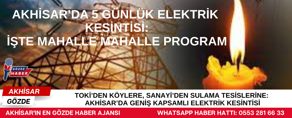 Gediz Elektrik Dağıtım A.Ş. tarafından yapılan açıklamaya göre, Akhisar genelinde şebeke bakım, onarım ve tesis çalışmaları kapsamında farklı gün ve saatlerde planlı elektrik kesintileri uygulanacak. Kesintilerin vatandaşların güvenliği ve elektrik hizmetinin sürdürülebilirliği için zorunlu olduğu belirtilirken, kesinti programı şu şekilde duyuruldu: